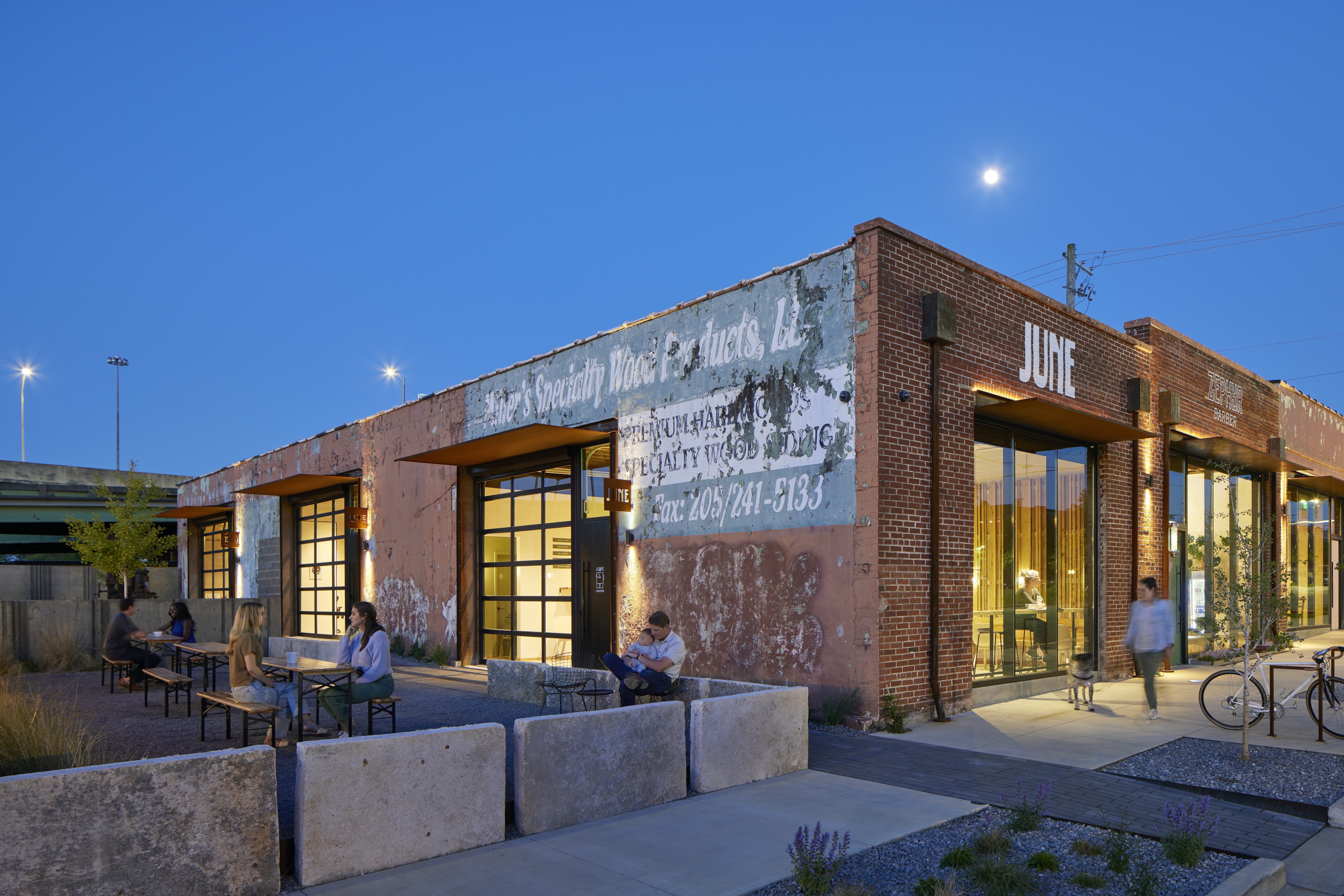 Originally built in 1951, this 7,558 square foot mid-century masonry building once belonged to the Birmingham Poultry and Egg Co., followed by Millers Specialty Wood Products, featured on the exterior. Acquired and redeveloped by Locke GC and David Baker architects, this site now houses June Coffee, Zephyr Barber Studio, and Last Call Baking, along with Locke and David Baker Architects offices.